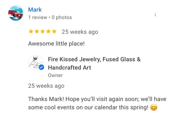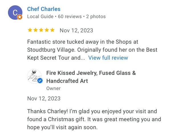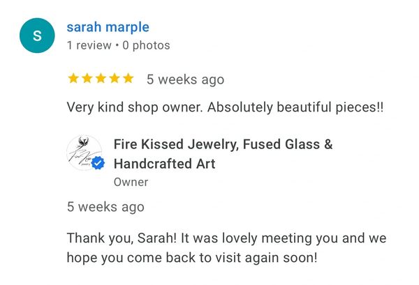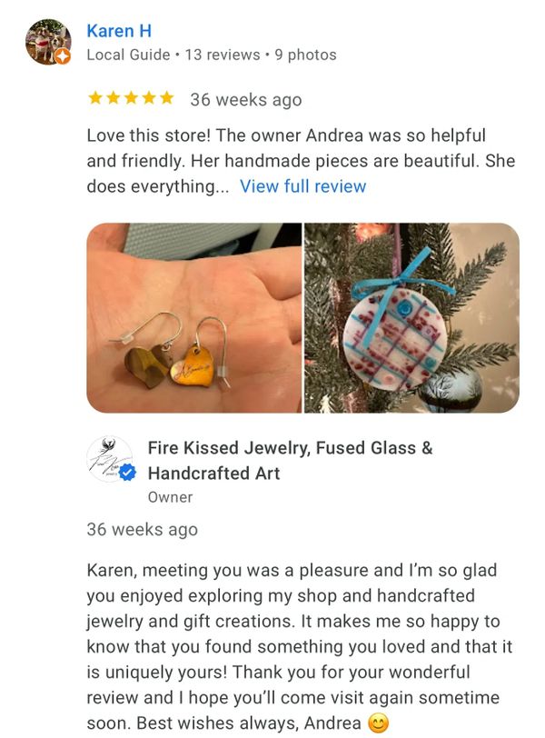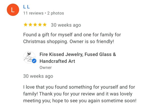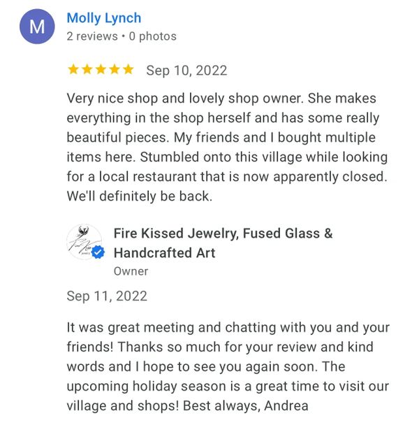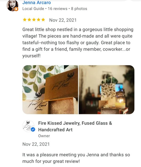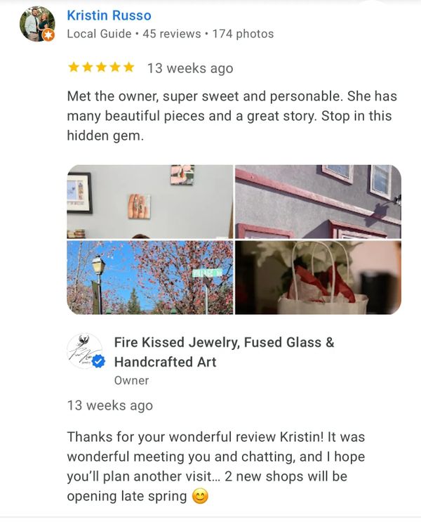 The most beautiful hand made jewelry and the owner/maker is the sweetest person. Her personality reflects her work. We also fell in love with her kitty in the shop. If you want a beautiful gift for someone this is the place to go. I now have a beautiful hand made sun catcher hanging in my window along with some gorgeous jewelry.