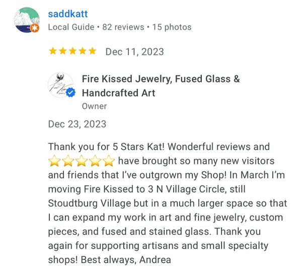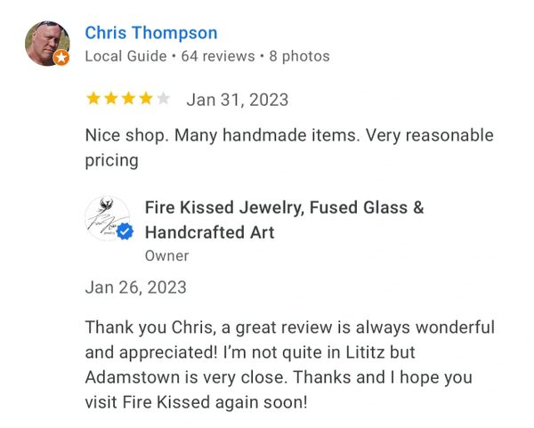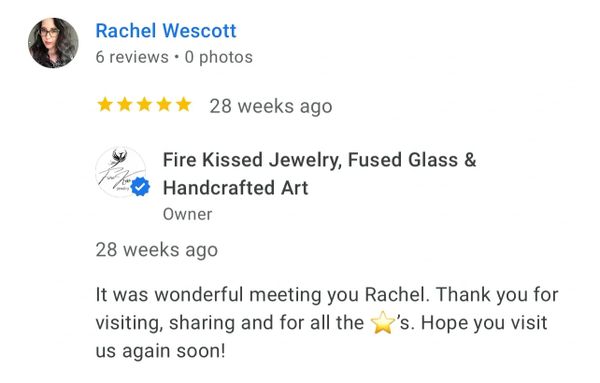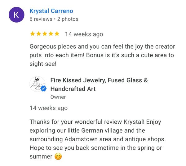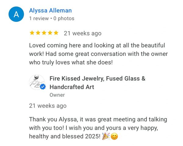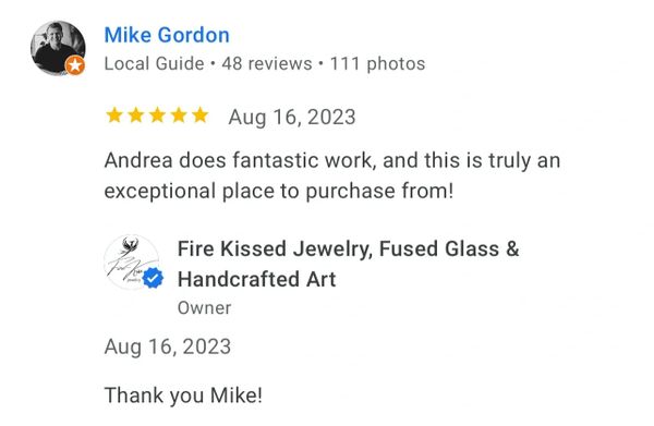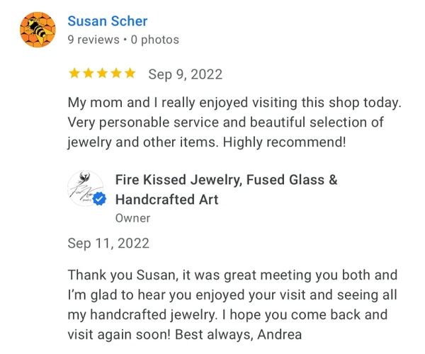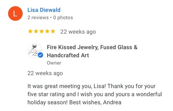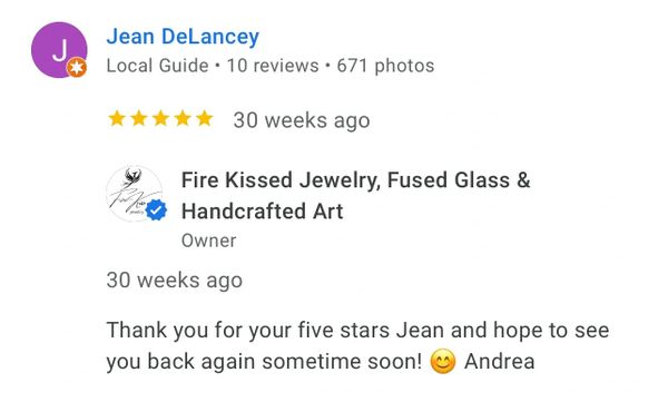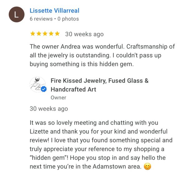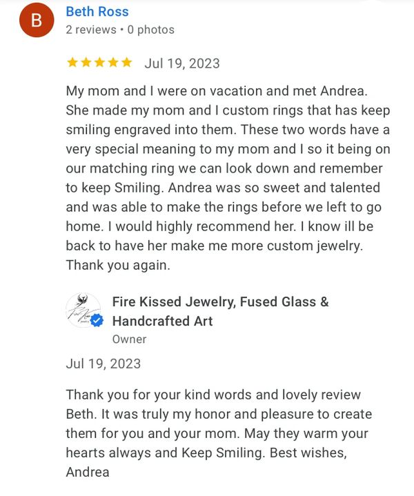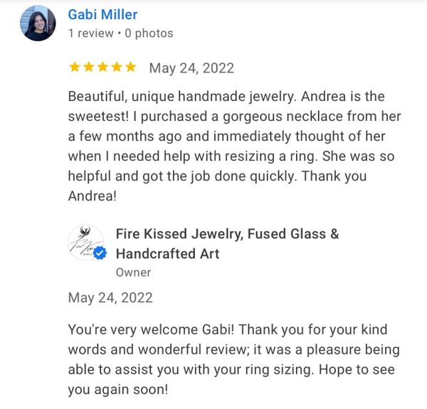 I recently made my 3rd purchase from Fire Kissed Jewelry. I love Andrea's attention to detail and creativity. Each piece is beautifully handcrafted and unique. I am already looking forward to my next purchase!