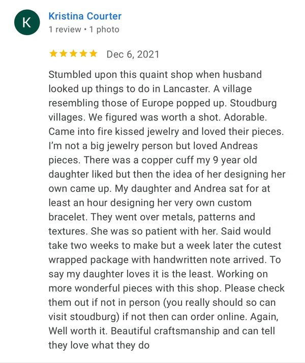 Don't overlook Fire Kissed Jewelry in quaint Stoudtburg Village if you are looking for a spot to find a special gift for yourself or a friend. Met Andrea two weekends ago and was so impressed by her meticulous detail and passion for what she does that I had to purchase a piece. Everything is so beautifully crafted and unique! My working hands now have the sweetest spinner pinkie ring. :)